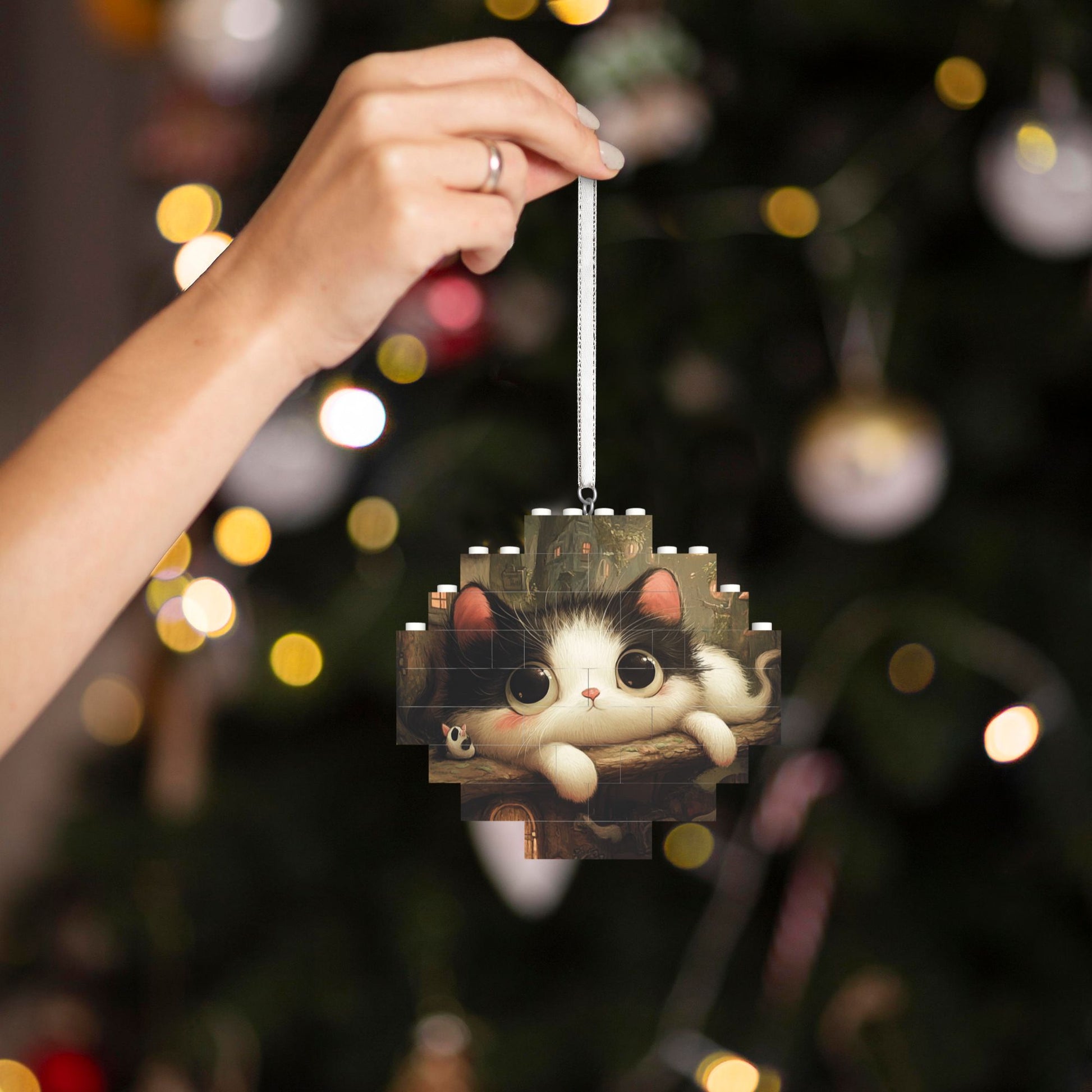 The Adorable Black-and-White Cat Puzzle Ornament features a charming design of a big-eyed black-and-white kitten lounging on a tree branch in a whimsical forest setting. With a cozy and magical vibe, this DIY building block ornament is perfect for home decoration, thoughtful gifting, or as a delightful hands-on project.