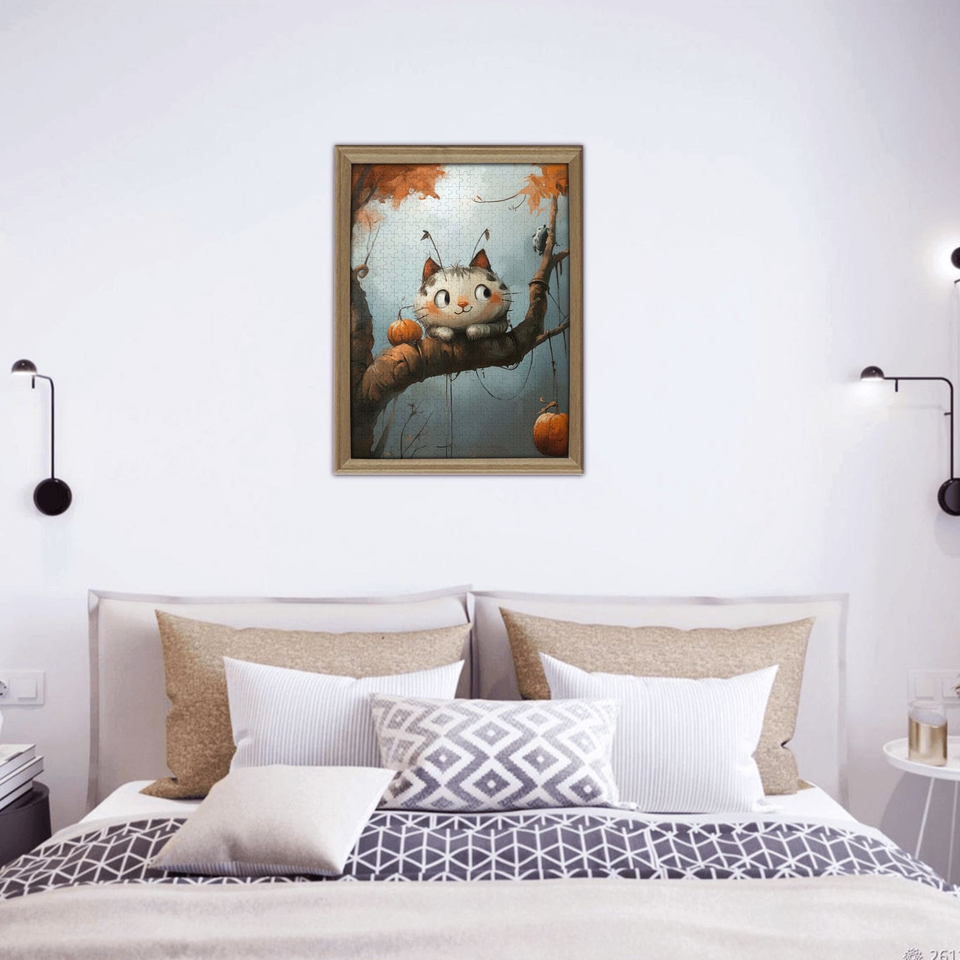 Step into a whimsical autumn scene with the Autumn Whimsy Cat Puzzle, featuring a charming cat perched on a tree branch surrounded by pumpkins and falling leaves. This delightful artwork brings the coziness of fall to your puzzle time, offering a fun and relaxing experience. Perfect for personal enjoyment or as a unique decorative piece.